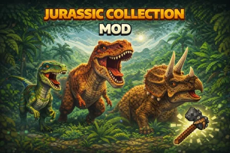 Jurassic Collection — a Jurassic Park-themed Bedrock addon that lets you build a real theme park with powered electric fences and dangerous dinosaurs like the Metriacanthosaurus roaming your world.