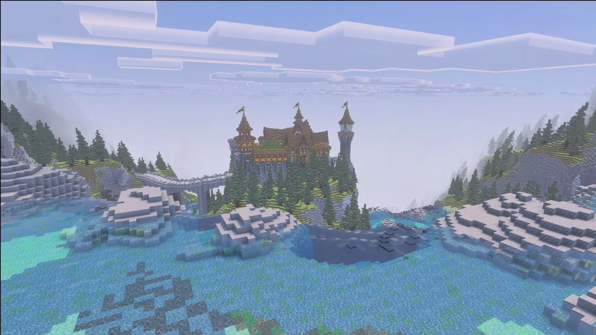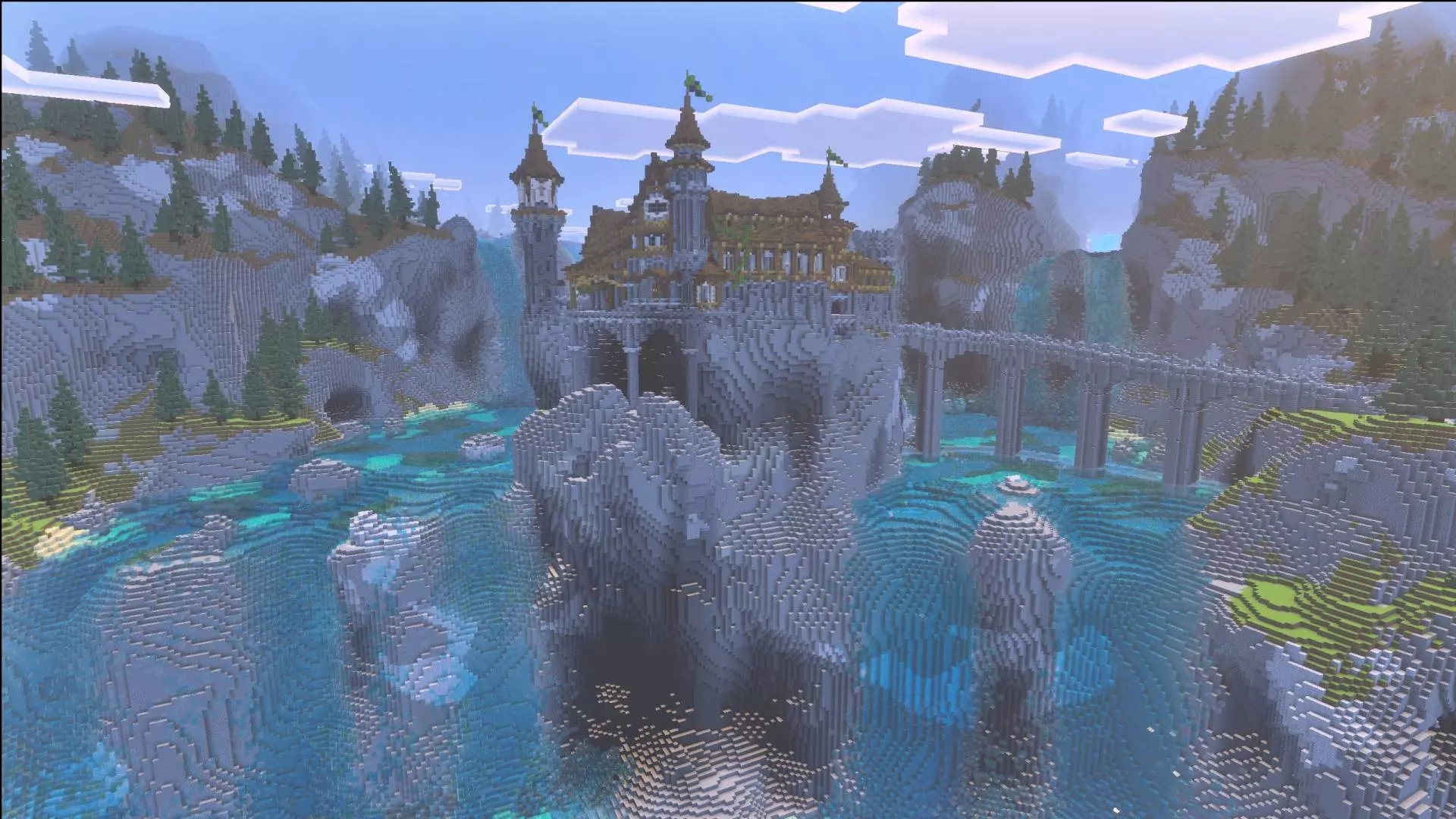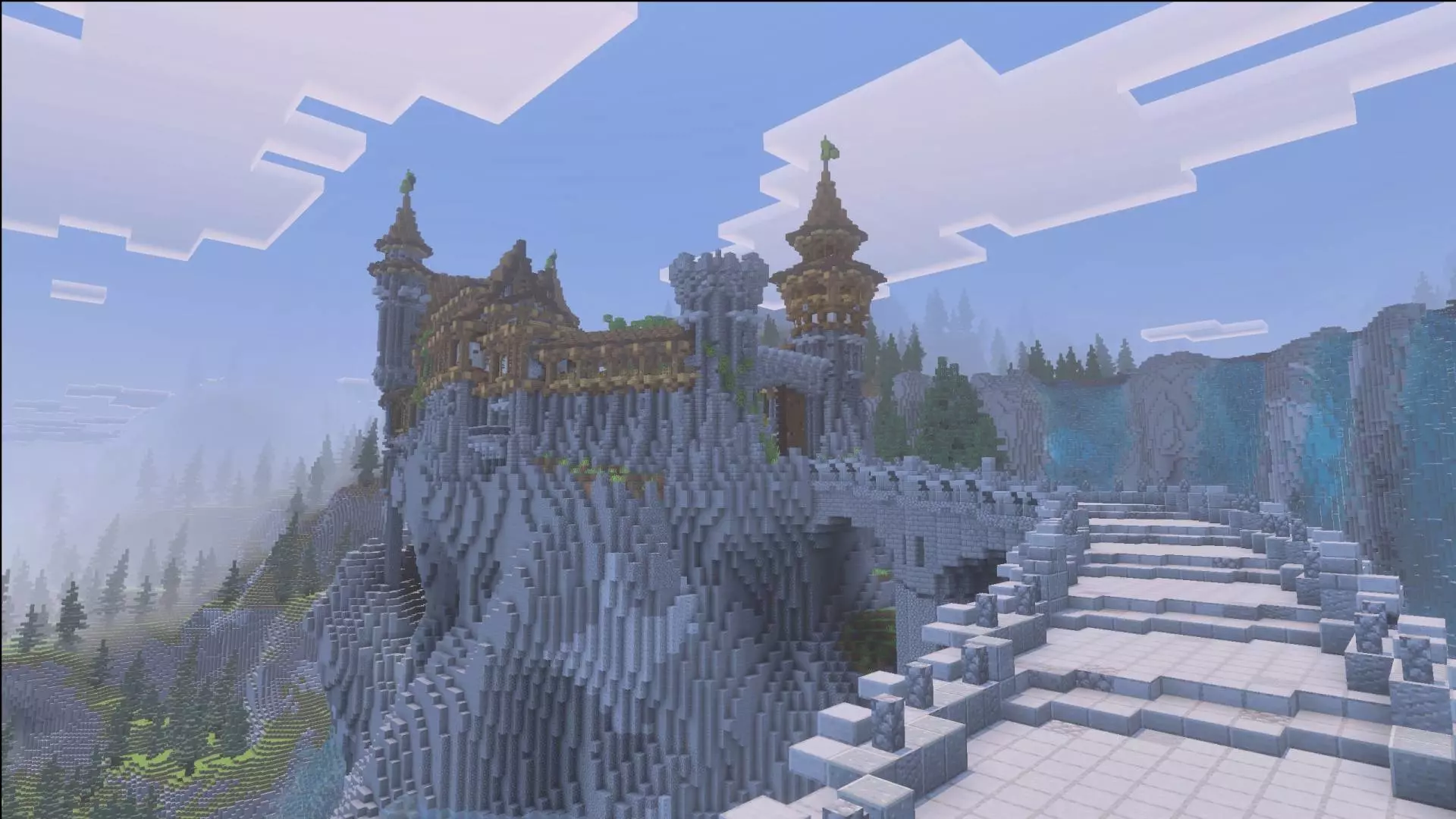 The medieval/fantasy vibe gives you a lot to play with depending on how you like to run maps. If you’re in survival, you can treat the waterfall cliff as your natural defense line and the castle as your long-term base idea. Water cliffs are a cheat code for safety, because they create choke points for how you move in and out, and they force you to think about vertical travel—ladders, stair paths carved into the cliff, or safe routes that don’t turn into a fall damage disaster. Even if you don’t add anything new, just navigating around a giant waterfall cliff changes how your sessions feel. You’re not sprinting across fields; you’re planning climbs, scouting ledges, and picking routes that keep you alive when you’re carrying loot.