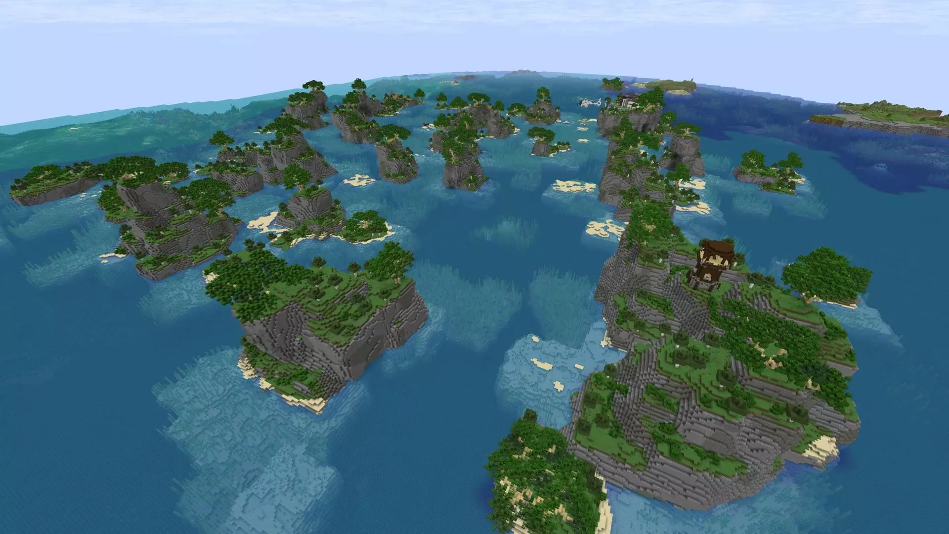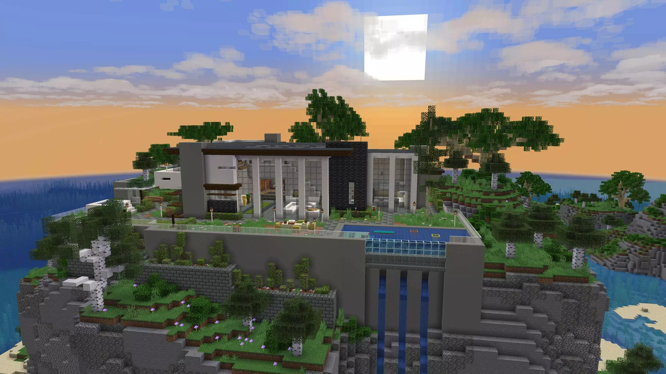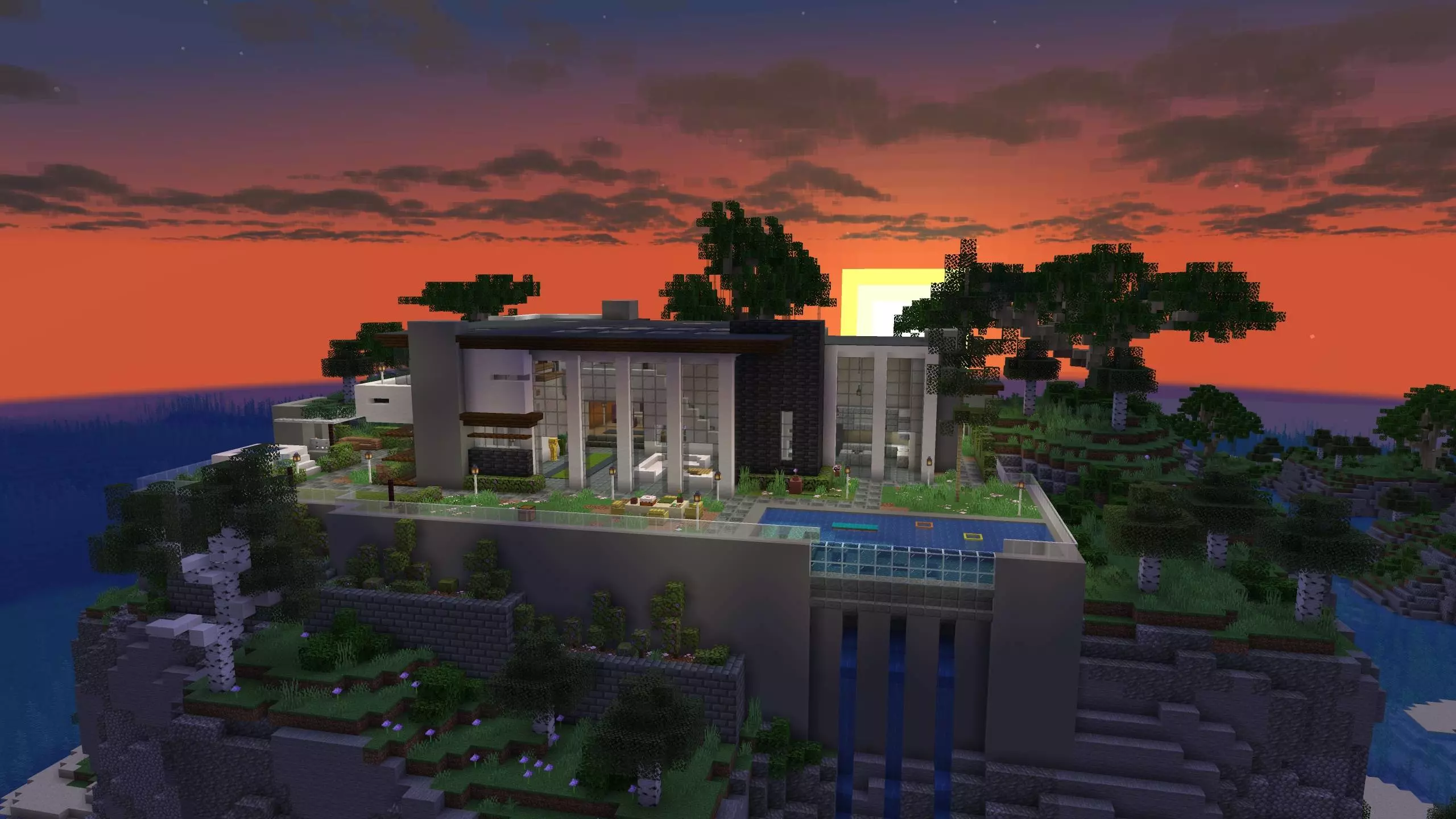 Modern Mansion Map (Achievements On) — a survival-compatible cliff-island mansion drop where you start in a classic vanilla world with a village nearby and a pillager outpost adding real pressure.