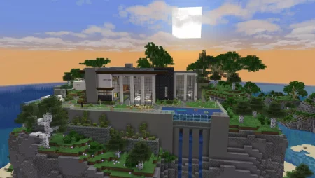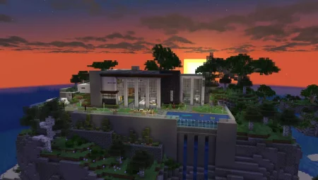 Modern Mansion Map (Achievements On) is best if you want a survival world that starts strong. You’re not spending your first week in a dirt hut—you’re starting with a mansion on a cliff island, then letting the vanilla world around it create the real gameplay: exploring, gearing up, dealing with the outpost pressure, and slowly expanding your mansion area into a full survival empire while achievements stay enabled the whole time.