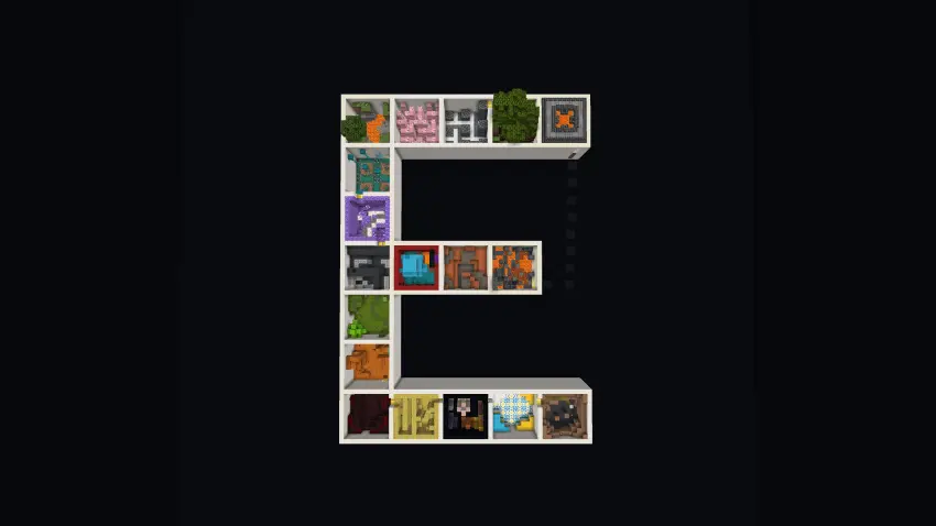 The map is part of the A–Z Parkour Series, and Parkour E Map is the “E” entry with new layouts and challenges compared to the earlier letters. Visually, the whole thing is structured like the letter E, and each segment of that E holds its own set of unique parkour levels. That’s a nice design touch because it makes the map feel like an actual themed build instead of just a random line of parkour rooms. It also helps you track progress mentally—like “I cleared this segment, now I’m moving to the next arm of the E.”