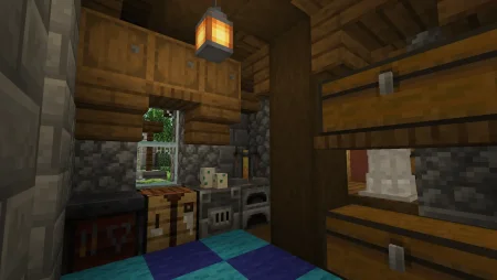 You spawn inside a finished timber house that actually works as a base, not just a screenshot. Bed, tools, and food are placed where you’d put them yourself, so the first day isn’t panic crafting—it’s getting a rhythm. The courtyard walls do the heavy lifting early. Gates and corners give you clean choke points, parapets give you angles to thin a wave without stepping into it, and lanterns along the inner walk keep the yard spawn-proof while still reading cozy at night. Treat the well as your hub: convert it into a proper infinite source with a hidden 2×2 under the grate, stash a bucket on a hook by the door, and you’ll never jog across the yard mid-fight just to put out a fire or prime farmland.