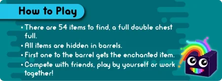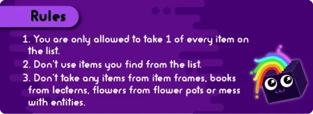 Crystal Lotus Hunt Map is built for group play on Realms, LAN, or small servers. A full round feels like a mix of speedrunning and hide-and-seek. Players fan out through the aurora landscape, sliding across bridges, dropping between platforms, and diving into little side areas trying to be the first to open each barrel. Because you’re not allowed to steal from item frames, lecterns, or entities, everyone has to play fair and focus on the actual hunt instead of tearing the map apart. You also can’t eat or use the list items, so there’s no sneaky advantage from burning through loot; your inventory stays as a scorecard, not a toolbox.