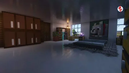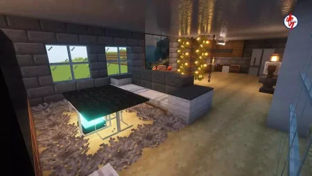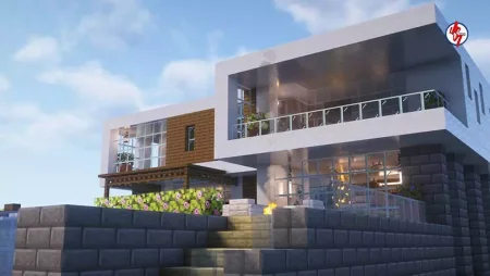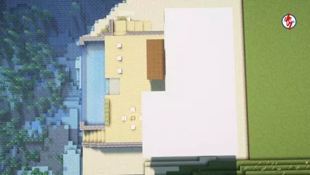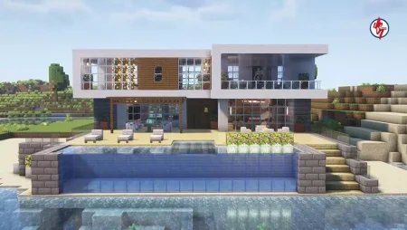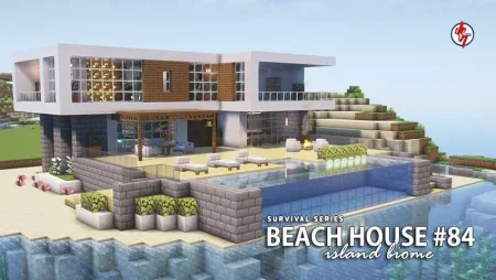 You wake up to waves and glass-bright morning light, not a dirt cube. The plan writes itself the moment you step onto the patio. The house is laid out for actual play: a short path from door to workstations, wide sightlines through floor-to-ceiling panes so you read weather and mobs without committing outside, and just enough room between furniture to sprint when dusk turns messy. The yard isn’t a prop—there’s space to move, fight, and sort outdoors, and the pool sits close enough to be useful, not just pretty. Use it as a safe infinite water source, a bubble-column test bed, and a soft landing when you drop off the roof after torching that last ledge. Practice the jump early; the muscle memory pays for itself during bad nights.