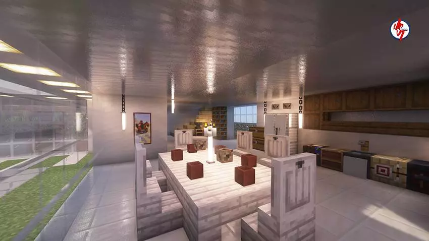You spawn inside a finished home that actually plays well. The floor plan is all clean angles and short routes: kitchen and smelter tucked a few steps from the front door, storage zones that don’t make you zigzag, and sightlines through glass so you read weather and mob traffic before you commit outside. Nothing here asks for cheats, and every ding counts toward your profile, so a chill evening on this map still pushes real progression. The island setting does half the work for you. Water keeps patrols honest, the horizon is easy to read, and when fog rolls in, the house silhouette stays visible through those long panes like a lighthouse you built for yourself.