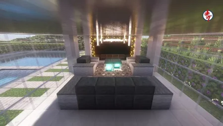 Vertical progress stays tidy. Feed a bubble column straight from the terrace pool into a hidden shaft, then break out under the island so cave noise never spills into the living room. Keep the Nether portal on a small offshore plinth; the hum stays off your floors and villagers won’t wander near it after you expand. Once you’re kitted, the spawn-proof roof doubles as a safe staging pad for nether returns and nighttime sorting, and the pool remains your free fall-cancel if you miss a rooftop jump during repairs.