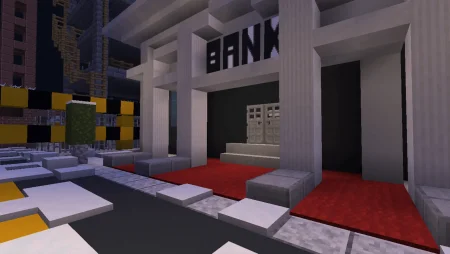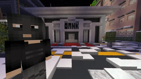 Snow, carols, and a bank that’s running a skeleton crew—perfect cover for a clean job in Minecraft. The map plays like a stealth-puzzle sprint with enough freedom to feel clever. You start outside the branch with a couple of obvious options and a few that only reveal themselves if you bother to look. The front doors are a flex but noisy; the service alley is quieter if you kill lights first; the rooftop skylight is safest if you can thread a short parkour line without slipping on the glass. Peek through windows and you’ll spot patrol patterns and camera stand-ins; redstone lamps and observers act like sight cones, so treat their glow like a moving “do not cross” line and time your crawls between shadows.