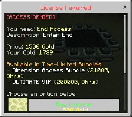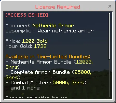 This addon doesn’t mess around with enforcement either. If you try to wear armor you didn’t pay for, it gets removed every second, so you can’t “sneak it on for a fight.” If you step into a portal without the right dimension license, the game pushes you back with proper knockback, so you can’t glitch your way through. Try hitting mobs with unlicensed combat gear and your damage just gets healed right back, which makes every blocked action feel like bouncing off an invisible wall. And it’s not only combat or mining—pretty much every interaction gets checked: breaking, placing, opening, using, throwing, riding, taming, breeding. The whole world becomes a gated system you have to buy your way through.