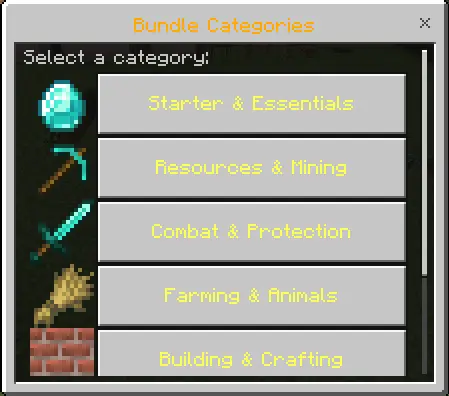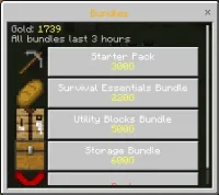 To keep it from being pure permanent purchases, Survival P2W Mod also runs time-limited bundles that last 3 hours, basically like short-term “subscriptions” when you need access fast. There are 40 bundles total, and the prices are the kind that make you stare at your gold count like it’s life support. The Starter Pack is 300G for basic tools and blocks, Complete Ores is 2200G to unlock every ore, Combat Master is 5000G for full combat access, and Ultimate VIP is 20000G to remove restrictions temporarily. The UI actually helps you make decisions instead of guessing: when you get blocked, it opens an interactive menu showing the license, your gold balance, bundles that include it, and quick purchase options. Bundle screens show what’s included, mark what you already own, show time remaining, and let you renew, so the strategy becomes “what do I buy forever” versus “what do I rent for a tough push.”