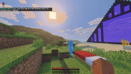 What makes it extra clutch is that it works across dimensions. If you die in the Nether and respawn in the Overworld, the soul doesn’t just give up and leave your stuff behind—it follows the rules of the addon and keeps moving toward your respawn point. That’s huge for real survival gameplay, because Nether deaths are usually the most punishing: you respawn far away, you’re undergeared, and the route back is a mess. Here, the pressure flips from “can I physically get back in time?” to “can I safely claim my courier when it arrives?” The soul also shows your name and an item count, so it’s not some mystery mob wandering around; you know it’s yours, and you get a quick read on how much it’s carrying. When it spawns, it even shows an ETA, which is the kind of small quality-of-life detail that keeps things from feeling random.
