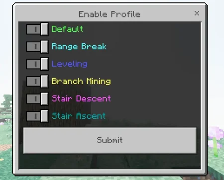 Switching break profiles is also quick: hold a tool (like a pickaxe), then press Use (right click) while sneaking to select a profile. If you want the profile to be super visible and easy to read, you use the “Useful addon settings” item → Break Setting → Enable Profile. Same settings item is where you do deeper setup: Break Setting → Profile List, and you can tweak details (the addon expects you to check the tooltip for the finer knobs).
