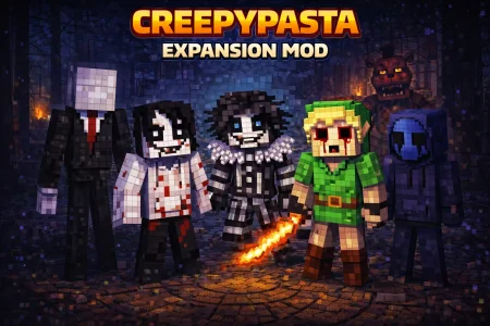 Creepypasta Expansion Mod is made for players who want their nights to feel unsafe again. Instead of the usual “sleep it off and keep mining,” this add-on throws a bunch of creepy legends and internet-horror inspired mobs into one package, so your world can flip from chill to paranoid fast. It’s not just one mascot monster either—the whole point is variety, like you’re stepping into a mashup of classic creepypasta names and weird encounters that can show up when you’re exploring, traveling, or just trying to get back home with loot. The vibe is straight horror sandbox: the same forests and villages you’re used to suddenly feel suspicious, and you start checking your surroundings way more than you normally would.