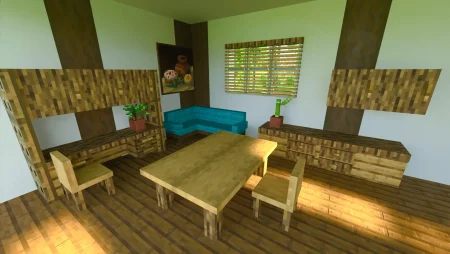 Drop this into a fresh world and your builds stop looking like warehouses. Kitchens get counters and fridges, living rooms pick up couches and coffee tables, bedrooms finally have wardrobes instead of random chests stacked to the ceiling. The best part is how naturally it folds into survival. You’re still gathering, crafting, and laying out rooms block by block, but now the interior loop feels intentional: cook where you actually cook, stash tools in cabinets by the door you actually use, crash on a sofa while you watch the sunset through a proper window instead of standing on a crafting table pretending it’s a bench. It’s a small shift that changes how you move through a base hour after hour.