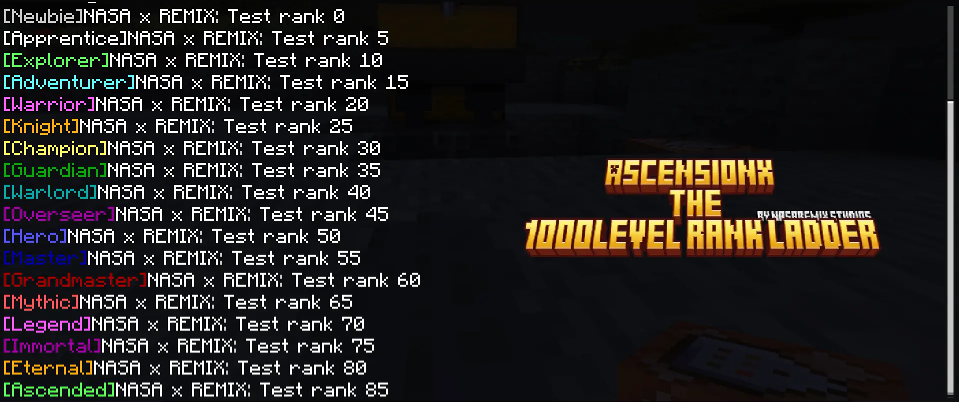 Ascension X — a clean 1→1000 chat-rank ladder that rides Bedrock’s native levels and turns everyday play into visible clout.