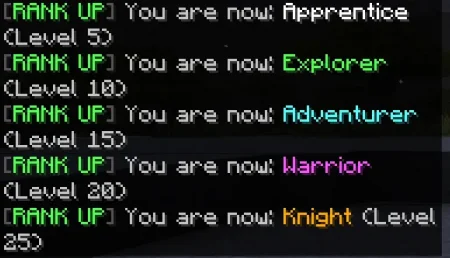 You don’t grind some weird side counter here—every mine tick, mob fight, furnace batch, trade, and adventure feeds the same level track you already use, and each threshold unlocks a new color-coded chat title that actually feels earned. The loop is simple and satisfying: log on, do what you were going to do anyway, and watch your name evolve across the realm feed. Hit a big build milestone, cash in smelts, or wrap a raid, then pop open the rank menu with a compass or clock to check your current stage and the next goalpost. It’s lightweight, it’s native, and it plays nice with Realms and SMPs because nobody has to learn a second system or babysit a plugin.