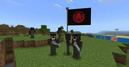 In regular survival, the addon shines when you build around it. Turn a simple stone base into an underground command bunker, hang extra uniforms on armor stands, and park your robots in a hangar-style garage. Then grab the shield, gear up your friends in matching or rival outfits, and run missions: escort villagers between outposts, clear out dangerous areas at night, or stage mock training drills where one player plays the villain and everyone else has to track them across the map. Because the pack focuses on weapons, clothing, enemies, and machines, you can push combat way harder than usual without losing that grounded, crafted feel.