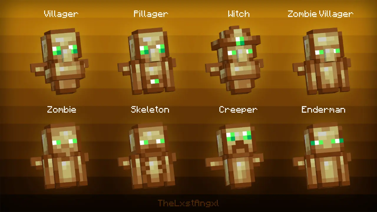 Instead of the same flat little icon in your hand, this mod turns the totem of undying into a proper 3D collectible, and not just one model either. You get a whole lineup of mob-shaped totems that sit in your off-hand or hotbar like miniature statues. When a clutch actually happens in the middle of a fight, you don’t just see particles and hearts; you get a split-second look at a tiny villager, pillager, witch, zombie, skeleton, creeper, enderman, allay, vex, piglin, slime, warden, creaking, or iron golem model doing the saving. It feels way more personal than the default texture, especially when you’re running around with a favorite mob idol that basically becomes your “guardian spirit” for that run.