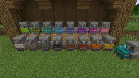 This addon takes the original tuff golem concept and actually turns it into something you can build stories around in your world. Summoning one is as simple and familiar as it gets: you stack a tuff block with a carved pumpkin on top and the golem pops into existence, just like other classic golems. At first it’s bare stone, but the fun starts when you walk up with carpets. Any carpet color you use becomes its cloth, wrapping around the little statue and giving it personality. That cloth isn’t just cosmetic, either — only golems that are “dressed” are allowed to carry items, so the moment you put a color on them, they graduate from being set pieces to becoming tiny display stands. Interact normally and you can hand them items or take those items back, turning them into mobile pedestals that match your storage room, gallery, or trophy hall.