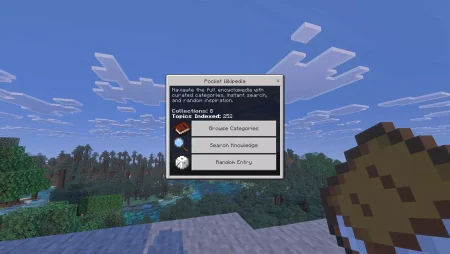 Pocket Wikipedia Mod turns a simple book into a full knowledge hub you can carry in your hotbar. Instead of pausing to grab your phone or search a website, you just hold a regular book, open the menu, and pull up info on whatever you’re dealing with right now. New block you’ve never seen? Weird mob behavior? Trying to remember what an enchant actually does at higher levels? You flip open the “wiki book” and the answer is sitting right there inside your world, no browser, no distractions, just straight info while you keep playing.