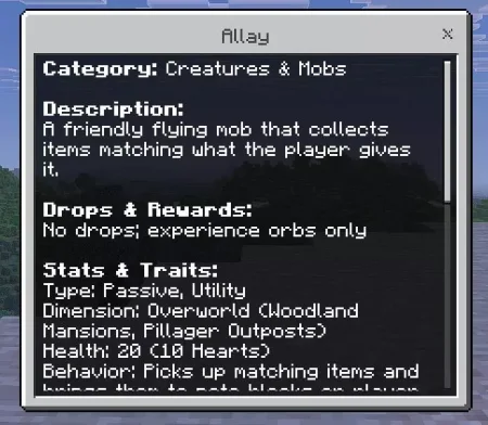 The UI is built to feel like a real guide, not a wall of text. You can browse by category when you’re just curious, or run filtered searches when you know exactly what you’re looking for. Want pure stats for a fight, or just drops, or some lore to give your build theme? You can tune the search to focus on descriptions, stats, or flavor separately. Mechanics & guides, structures & landmarks, enchantments & upgrades, plus the usual mobs/items/blocks/biomes collection — it all lives in one clean menu. Picture this: you’re deep in a cave, your friend asks “what does this enchant actually do?”, you pop open the book and read it off like the squad’s walking rulebook.