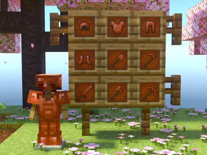 The armor set is where the mod really smooths out the early game. Copper armor gives more protection than leather or stone-era gear but still doesn’t step on iron’s toes. It’s a perfect temporary kit while you’re exploring caves, building a starter base, or learning the world on a fresh realm. You can match your copper blocks and builds with copper armor for a themed run, or just treat it as a comfy mid-tier set while you grind for iron and diamonds.