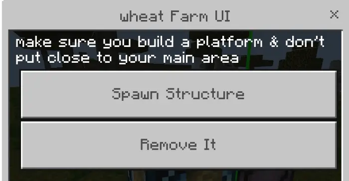 The clever part is how placing these farms actually works. When you drop a farm block, the addon doesn’t instantly overwrite your base or ruin your terrain. You get a preview structure that outlines the exact area the farm will take up, so you can see clearly if it clips into your house, cuts your road, or bumps into a hill you want to keep. If something looks off, you just interact with the preview, bring up a small UI, cancel it, and try again a few blocks over. Only when you’re happy do you confirm, and then the full build spawns instantly. On Minecraft Bedrock and MCPE this makes a huge difference: you can lay out a whole farming district around your main base or starter village without guessing and regretting it later.