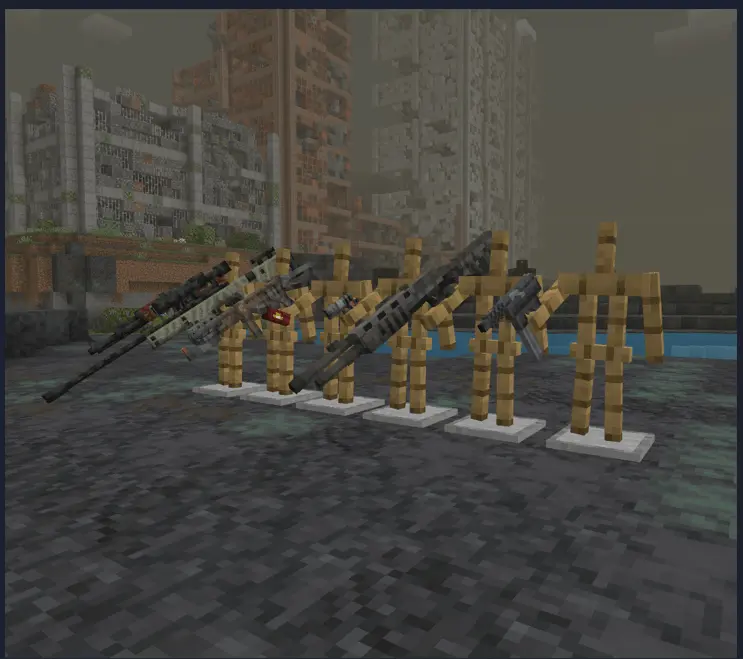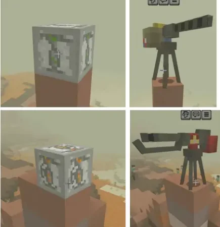 You’re not alone in all this, though. Human Survivors roam the ruins, some masked, some not, and a couple of variants will trade you masks, weapons, ammo, and even flamethrowers if you bring the right stuff. Their guns are the same family as the author’s Cordyceps project but with fresh models, textures, and a tweaked ammo system. You reload by carrying the right bullets and using the weapon, and most of them come empty when you pull them from abandoned barrels, so there’s always a bit of prep before you sprint back into red zones. Turret blocks can also be found in those structures; place one and it unfolds into either a standard or fire turret you can repair with iron, turning your base into a bunker. Smile Fungus armor crafted from fungus fragments gives you heavy protection with a full mushroom-horror look, and the anti-spore mask becomes almost mandatory in hot zones to stop wither ticks from infected blocks and monsters.