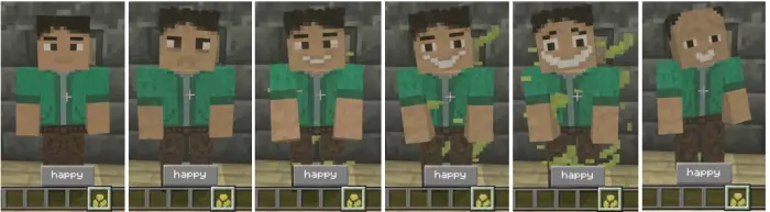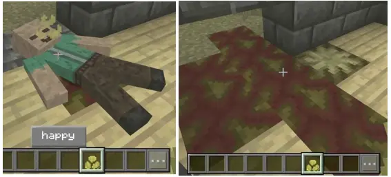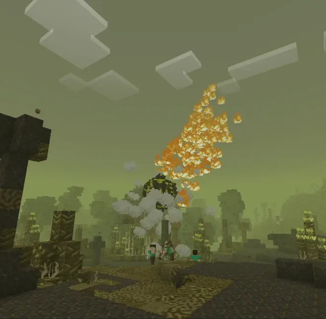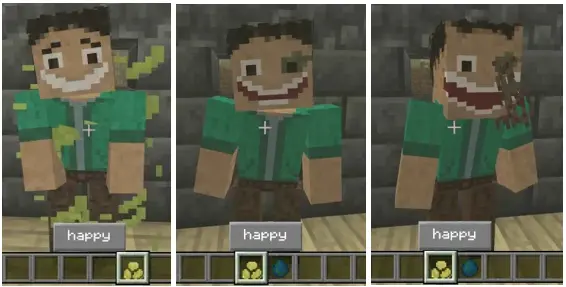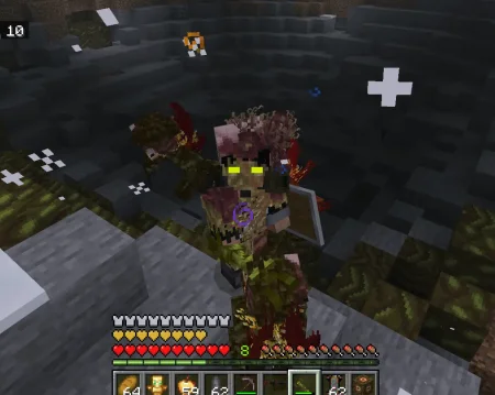 The human side of the infection is where things get nasty. Smile spores drifting off special Eye blocks can infect “humans,” pushing them through multiple stages. Variant A is the common starter case: by stage three they age out and die, spreading the fungus further, sometimes even in child form. With a lower chance, some of those A-types twist into Variant C instead, continuing to mutate instead of dropping dead, hitting harder and getting more aggressive as they climb toward stage seven. Higher stages can drop eye fragments and heart fragments used for Smile Fungus gear, but every fight is a risk. Some infected explode into corpses that keep leaking fungus blocks and inflict wither on any player not wearing a proper mask. If you’re already stinking of spores, the bacteria mobs treat you like one of them, which is funny right up until you forget normal survivors still see you as a walking hazard.