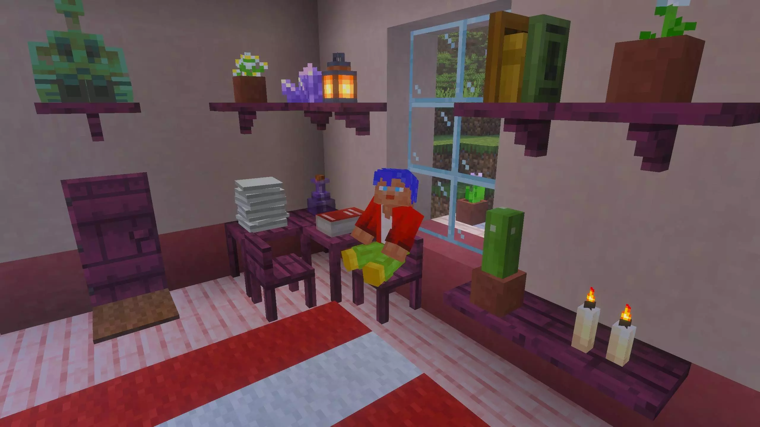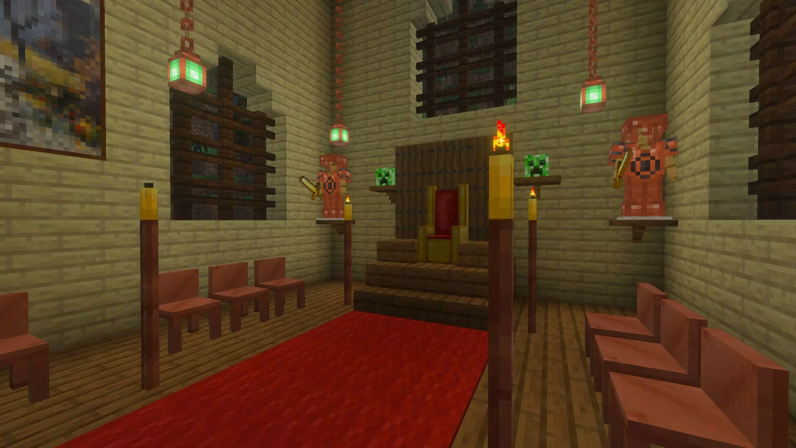 The seating selection is huge: 95 seating blocks total. You’ve got 23 chairs with both wooden and metal variations, 24 log benches that cover all wood and stripped variations, and 48 thrones that go hard with materials like wood, gold, and netherite. Thrones also let you pick padding in all 16 colors, so you can match a faction color, a bedroom palette, or whatever theme you’re running. Tables and wall-mounted shelves come in 23 variants each, and the material list is stacked: Oak, Birch, Spruce, Jungle, Acacia, Dark Oak, Mangrove, Cherry, Pale Oak, Bamboo, Crimson, and Warped, plus metal options like Iron, Gold, Netherite, and Copper with eight oxidization and waxed variations. That copper range is especially nice if you’re into builds that “age” over time or you want that greened-out rooftop look without having to fake it.