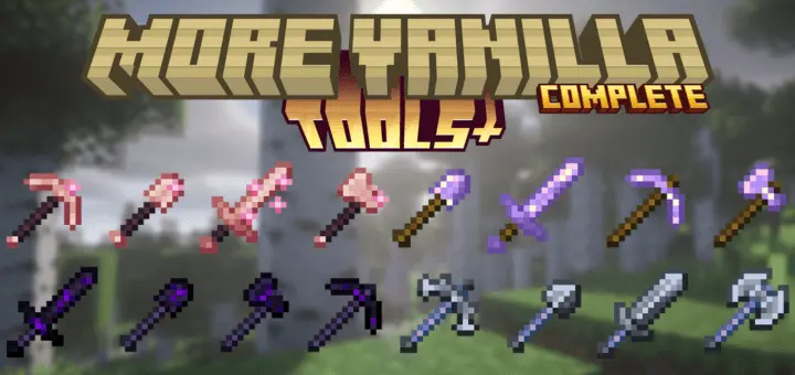 More Vanilla Tools Complete Mod — a big tool expansion for Minecraft Bedrock that adds new materials and specialty tools with balanced effects, clean particles, and real survival durability.
