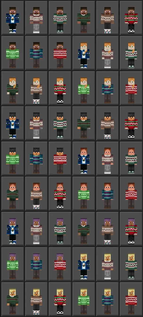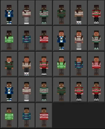 In Minecraft Bedrock / MCPE, this kind of skin pack hits hardest when you’re doing winter-themed stuff. Snow biomes, holiday maps, building a cozy village, decorating a big tree in the town square, or running a seasonal server event—these skins fit all of that instantly. Even if your world isn’t snowy, it still works because the sweaters bring that “winter hangout” energy to normal survival. Mining trips feel like you’re gearing up for a cold expedition, and base-building feels more like you’re setting up for a holiday season instead of just grinding blocks.