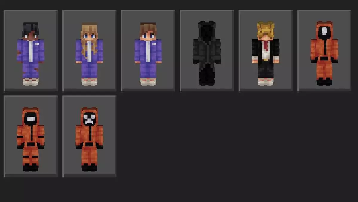 What I like about a pack like Squid Game Skin Pack is how easy it is to use without needing extra setup. You can run casual challenges with friends where the only “mechanic” is your imagination and the map you’re on. Tracksuits work great for team games, parkour races, droppers, boat bumps, or any arena build where you want everyone to look like competitors instead of random skins. The masks hit different for hide-and-seek, guard vs players, or “one hunter” style rounds where the masked player stands out on purpose. Since there’s a picture showing all 8 included skins, it’s also easy for players to pick their favorite and keep it consistent so people recognize you mid-chaos.