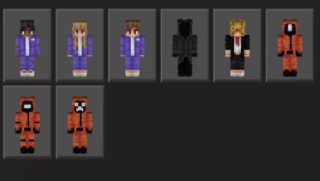 Squid Game Skin Pack also fits perfectly for server nights where you rotate mini-games and want a theme that stays fun for hours. Throw it on for PvP rounds, then swap to survival and keep the same look while you build a lobby, a holding room, or a challenge corridor in your base. The best part is it doesn’t lock you into one mood: the same skins can feel goofy and competitive during a quick challenge, then feel kinda creepy when you’re exploring at night or sneaking through tight caves. If you want a simple, recognizable theme for Minecraft Bedrock / MCPE that’s easy for a group to coordinate around, Squid Game Skin Pack is basically “tracksuit or mask, pick your side, and start playing” in skin form.