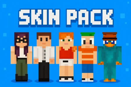 With the Phineas and Ferb Skins pack, your world suddenly feels like one long, endless summer episode. Throw on the Phineas skin and you instantly become that “idea guy” on the server, the one who keeps saying, “I know what we’re gonna do today,” before starting some ridiculous project like a massive roller coaster over the village or a mega-base shaped like a rocket. Swap to Ferb when it’s time to actually build the thing: quiet, focused, stacking blocks and redstone while everyone else runs around laughing and breaking stuff. The two together are perfect for co-op survival, especially if you’re the duo that always turns a normal base into something wild.
