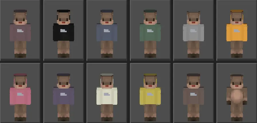 With the Animals In Hoodies Skin Pack on, you stop feeling like just another player in armor and start showing up as a full character. You’ve got all kinds of creatures to pick from, and each one can be worn two ways: clean base animal, or the same animal wrapped in a bright hoodie. That means you can go full cozy mode when you are hanging around the base, then swap to the plain version when you want a more serious vibe for screenshots, roleplay, or PvP. Because every hoodie comes in a bunch of bold colors, it is super easy to turn your Realm or server into a little squad-based cartoon. One friend picks a fox in a red hoodie, someone else runs a pastel frog, another locks in a wolf with a dark hoodie, and without saying a word everyone knows who’s who from across the map.